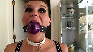 Skanky hoe in spectacular dress with a ball gag deserves a good punishment