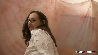 nerdy brun avec des lunettes michele james teste une grosse saucisse d'homme aux cheveux foncés qui sort du mur