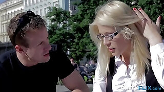 une blonde ringarde à lunettes se fait salir le visage après avoir fait l'amour avec un inconnu
