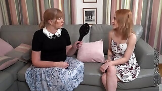 penchée sur les genoux de cougar, la méga-salope inexpérimentée se fait gifler le cul appétissant