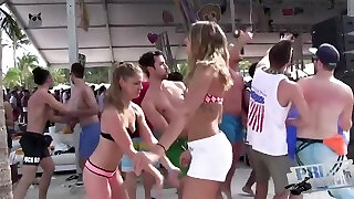 Drunk girls, dance, flash and get wild at a warm party