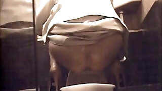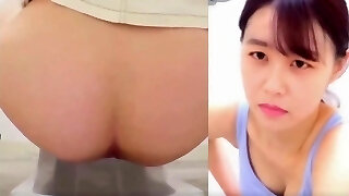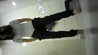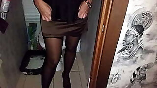 Superb young hot brunette doll in sexy skirt urinating in the public toiletroom