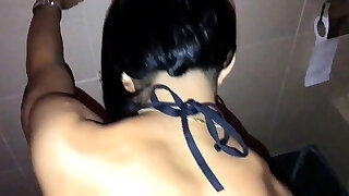 Lean and stellar white stranger girl filmed from behind in the toilet