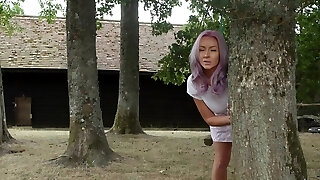 Sweet teen babe Adrian Maya deep-throats her fellow's dick on the green grass