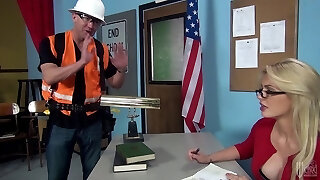 Ash-blonde with glasses letting the bald geezer shag her in the classroom