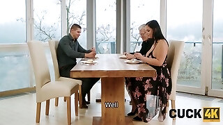 Shagging in the kitchen in front of a cuckold husband - Alina Lopez