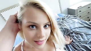 Masturbating blonde in glasses gulps cum after giving blowjob in POV