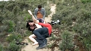 Girly-girl dark haired gets fucked in a forest with a strap-on